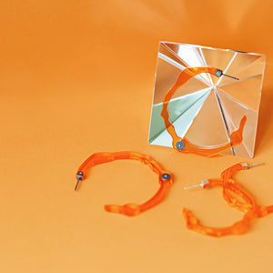 Bold, fiery orange acrylic and sterling silver embellishment discs come together to create showstopping hoops. Inspired by the power of color, orange invokes a story of joy and creativity. Often associated with warmth, change, determination, wellness, happiness, and freedom of expression. Every piece is handcrafted with meticulous detail. We include a card with the color's meaning.