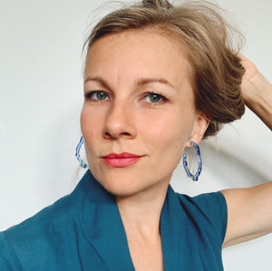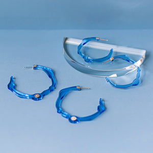 • Tranquil, ocean blue acrylic and sterling silver embellishment discs come together to create statement hoops that are bold and sophisticated. Inspired by the power of color, blue invokes a story of the sky and sea. Often associated with depth and stability, blue symbolizes trust, loyalty, wisdom, confidence, intelligence, faith, and truth. Every piece is handcrafted with meticulous detail. We include a card with the color's meaning.