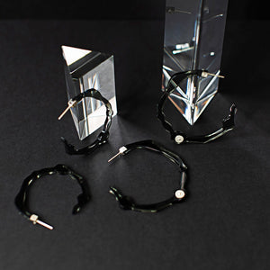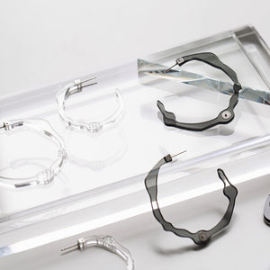Moody, twilight grey acrylic and sterling silver embellishment discs come together to create statement hoops that are bold and sophisticated. Inspired by the power of color, deep grey invokes a story that is extraordinary, dramatic, and mysterious. Every piece is handcrafted with meticulous detail. We include a card with the color's meaning.