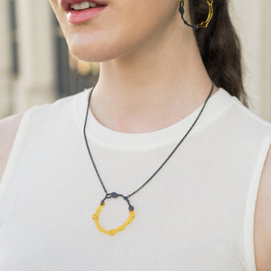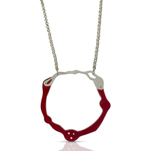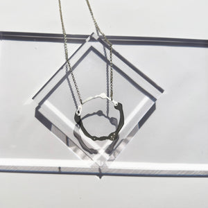 This round pendant necklace is a beauty - featuring a brushed silver seaweed element paired with our signature acrylic in a bold color with sterling silver inlays and perforations, giving the illusion of twinkling stars. Every piece is handcrafted with meticulous detail. The sterling silver chain is adjustable from 18" to 20.5" in length with a lobster clasp. Every piece is handcut and smoothed with meticulous detail.