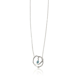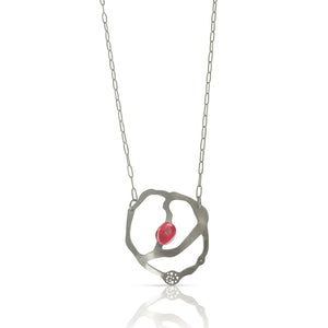 This pendant necklace offers a classic, but artful look to complement any outfit. The piece features a vibrant acrylic bit carefully mounted on a seaweed cluster pendant crafted from brushed sterling silver. The perforations give the illusion of twinkling stars. The necklace is 20" in length with lobster clasp. Every piece is handcut and smoothed with meticulous detail.