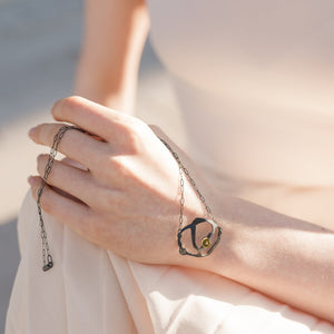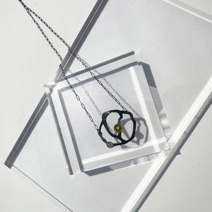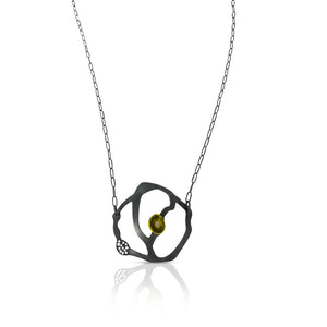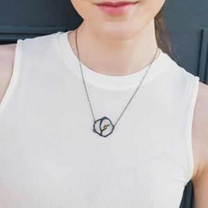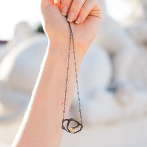 This pendant necklace offers a classic, but artful look to complement any outfit. The piece features a vibrant acrylic bit carefully mounted on a seaweed cluster pendant crafted from oxidized sterling silver. The perforations give the illusion of twinkling stars. The necklace is 20" in length with lobster clasp. Every piece is handcut and smoothed with meticulous detail.