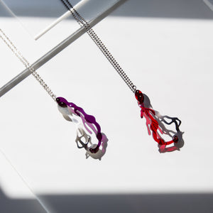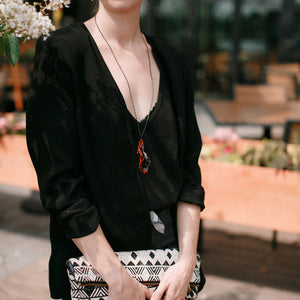 A long statement necklace that cleverly combines acrylic with oxidized sterling silver to create a pendant that is truly wearable art. The necklace is 30” long without a clasp. Every piece is hand cut and smoothed with meticulous detail.